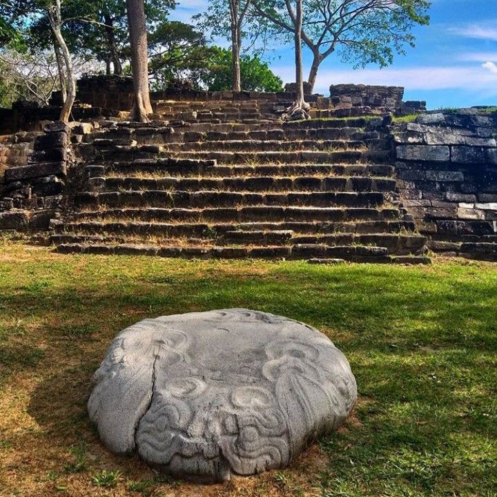 Es un amplio complejo que incluye basamentos para pirámides, largos muros de piedra, esculturas y estelas labradas.